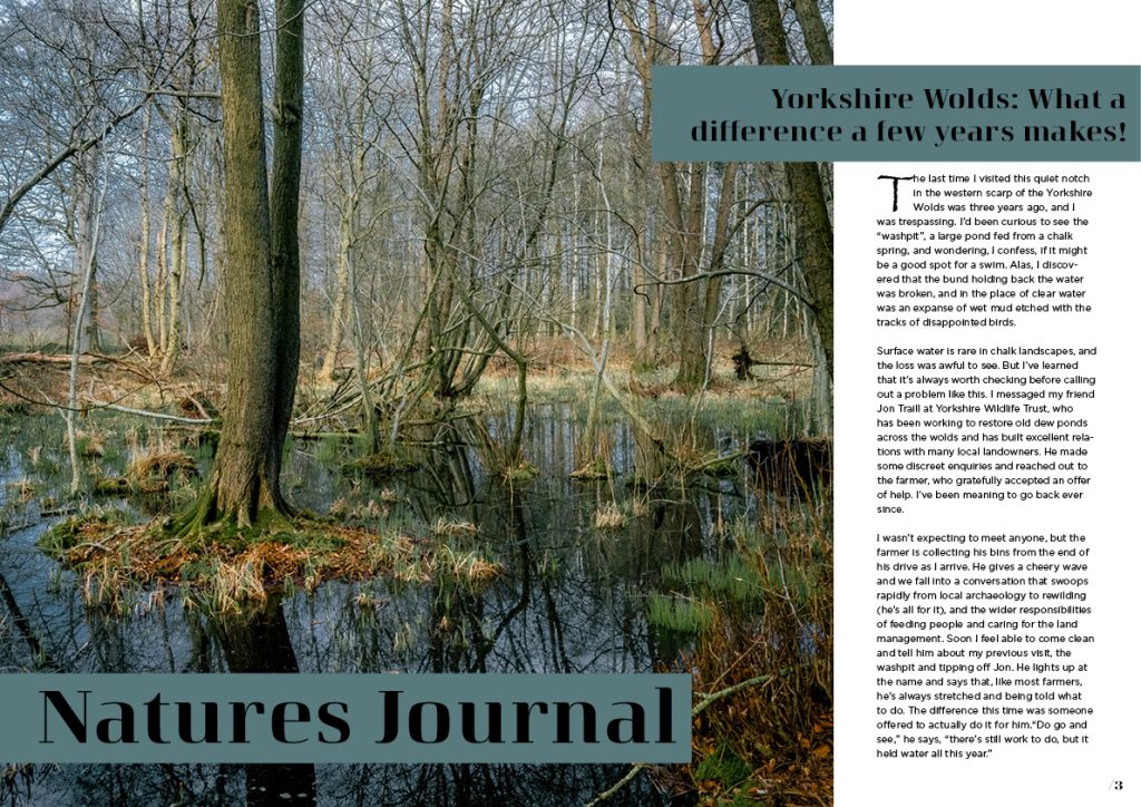 For my first 2 pages of the magazine i used the first article which was about the Yorkshire Wolds. On these pages there is a clear hierarchy using headlines and pull quotes from the article this is to grab the reader’s attention and get them interested. I have used the space effectively using the grid structure i chose so that none of the content is crammed together and the readability is easy. The images immediately grabs the reader’s attention. The type i have used on the main body of text is Gotham this is easy to read. I have also added a drop cap to the first paragraph to show the reader where the paragraph starts and to catch their eye. The colour palette relates to the article and also to the brands identity.