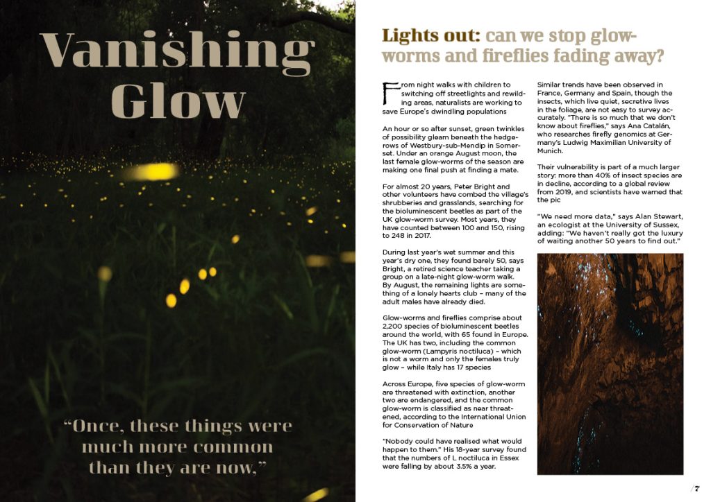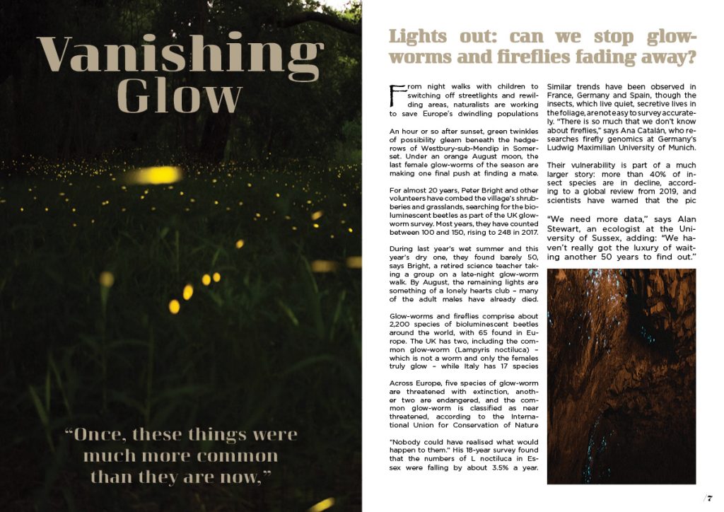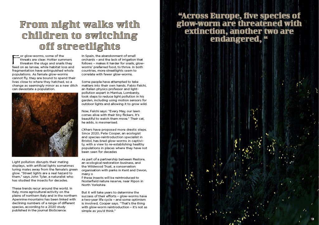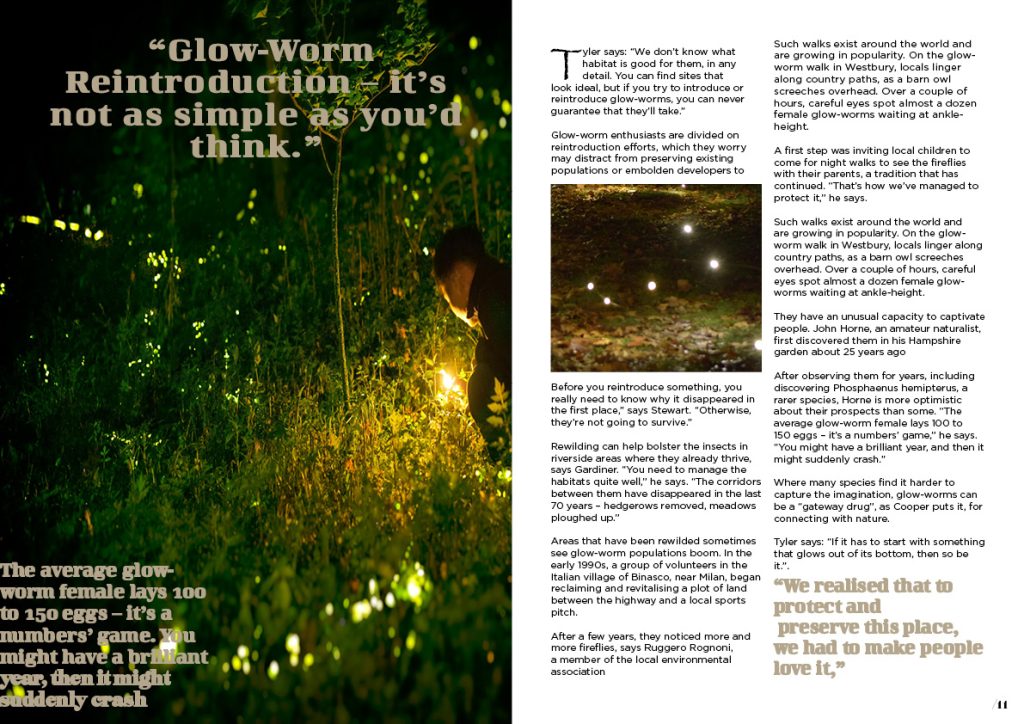 For this page i used a brown colour to represent the glow of the glow worms which represents clearly what this section is about. On the headline i used tracking to space out the letters to make it easy to read and stand out. On the subheading i used a darker colour to clearly emphasise the beginning of the quote from the article.